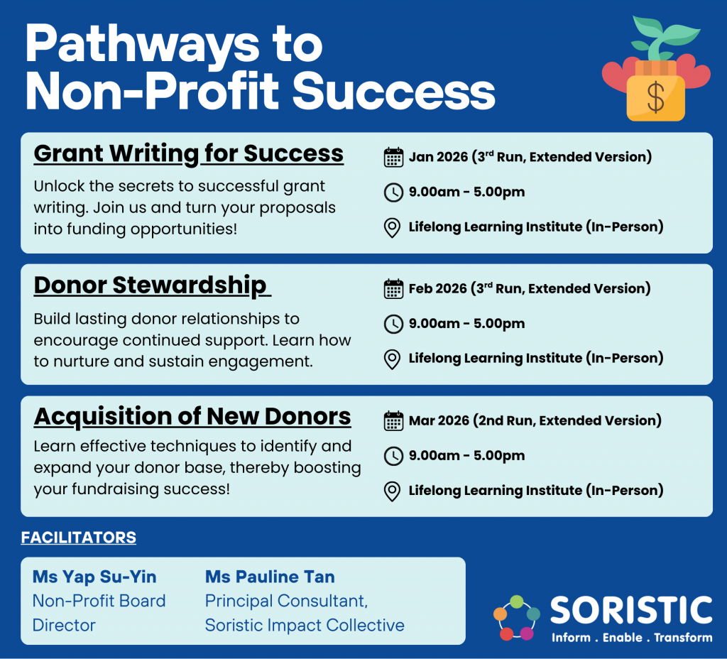 Fundraising Workshops 2026 (Extended & Enhanced) Our fundraising workshops are back in 2026, now in an 8-hour format (extended from 6.5 hours) to allow for deeper learning and hands-on application. Upcoming Workshops Grant Writing for Success (3rd Run) – 22nd Jan 2026 Donor Stewardship for Success (3rd Run) – 5 Feb 2026 Acquisition of New […]